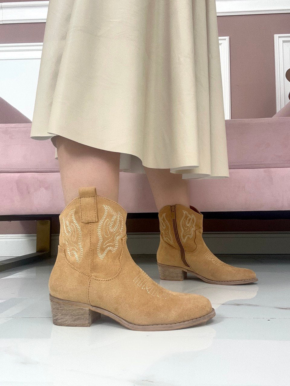 Camperos in camoscio con gambale lungo 13 cm con pianta comoda e tacchetto di 3 cm. Dettaglio con disegno neutro sul davanti e nei laterali.