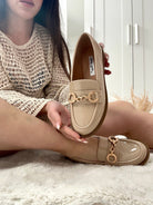 Mocassine in ecopelle lucida con dettaglio dorato sul davanti e tacchetto di 2 cm