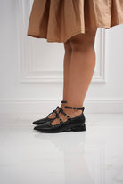 Ballerina a punta in ecopelle decorata con piccole borchie , fibbie laterali , chiusura con cinturino alla caviglia e tacco di 3 cm