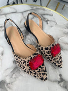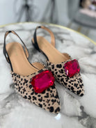 Ballerina a punta in tessuto animalier con dettaglio diamantato sul davanti , aperta sul retro con fibbietta in ecopelle e tacchetto di 1 cm