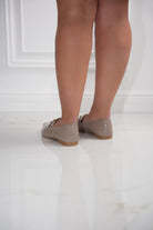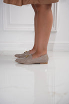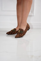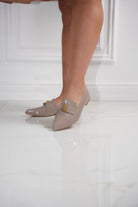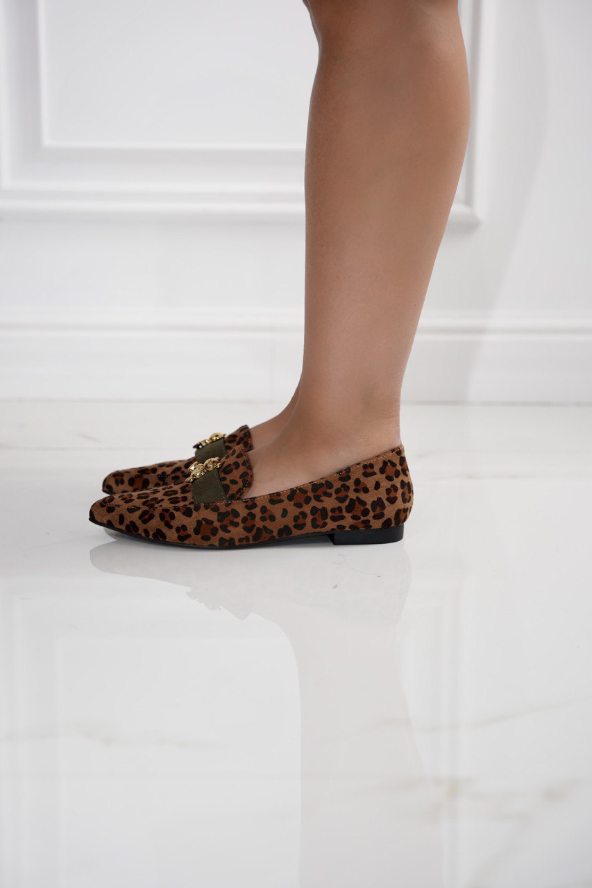 Mocassine a punta con tomaia in ecopelle e camoscio , decorate con orsetto dorato sul davanti e fondo in gomma