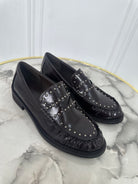 Mocassina in ecopelle con tacchetto in suola di soli 2 centimetri. Sulla pianta ha delle borchiette argento piccolissime
