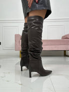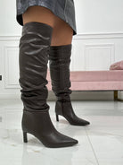 Stivale a punta in ecopelle con gambale alto fino a metà coscia, ha il tacco sottile alto 5 centimetri
