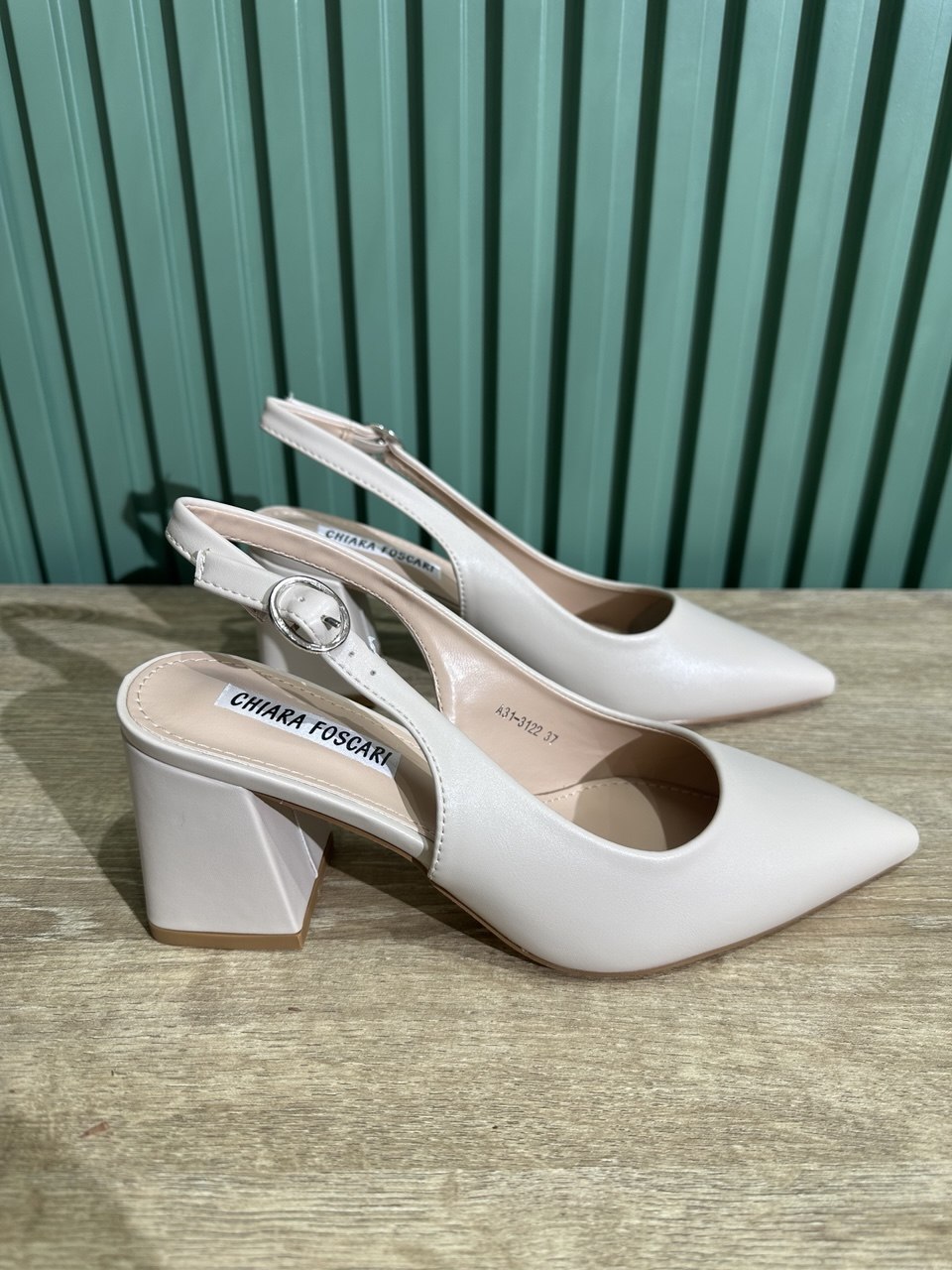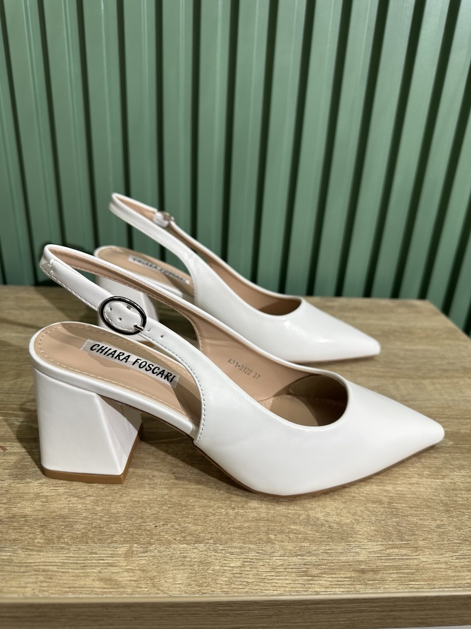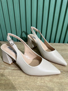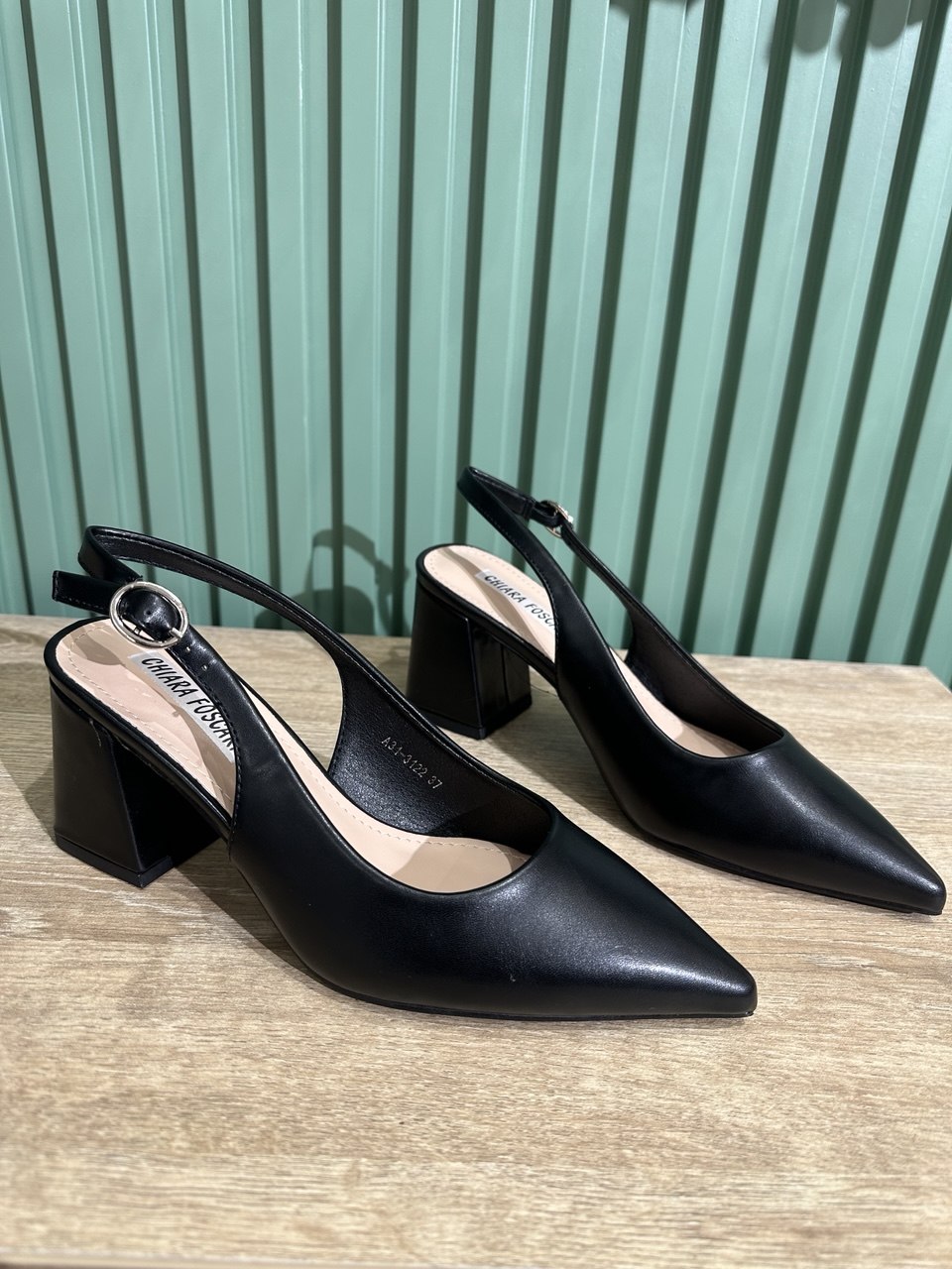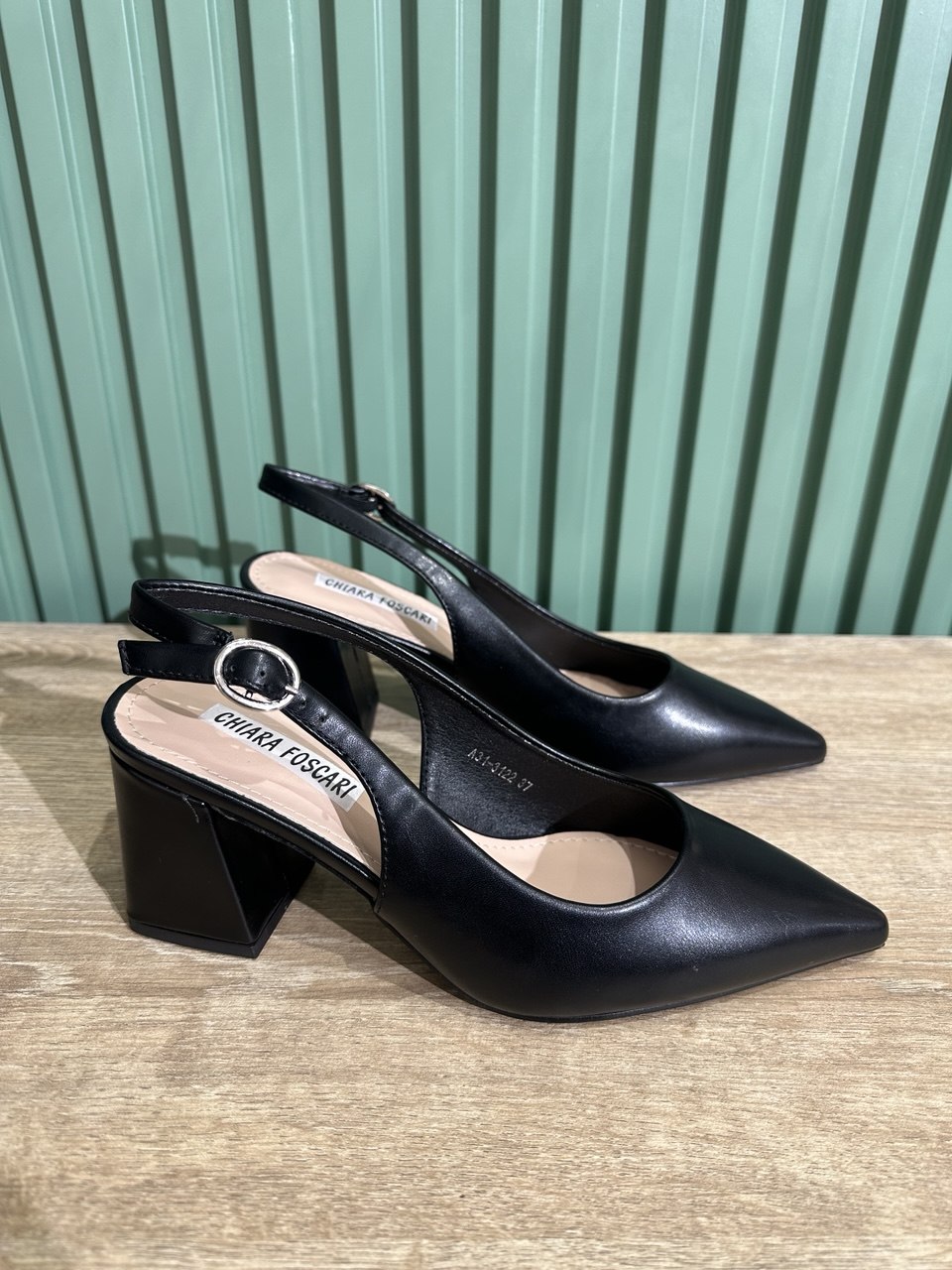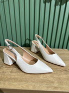 Decollete a punta in ecopelle aperte sul retro, con cinturino regolabile, il tacco largo è alto 6,5 centimetri.