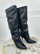 Stivale a punta in ecopelle, senza cerniera, si infila semplicemente. Largo alla gamba e al polpaccio, il tacco è a spillo alto 9 centimetri.