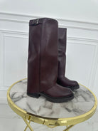 Stivale in ecopelle alto fin sotto al ginocchio, ha la cerniera all'interno per intero come chiusura, il tacco in gomma è alto 3 centimetri. Ha il risvolto per l'intero gambale e una fibbietta argento nel lato esterno