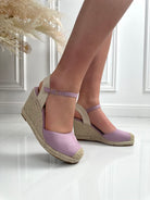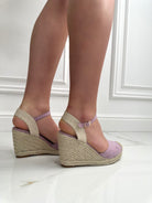 Sandali in camoscio , chiusura con cinturino e zeppa in corda di 7 cm