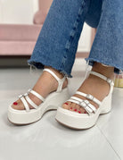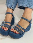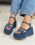 Sandali in ecopelle e denim con fasce sottili decorate con fibbiette in strass , chiusura con cinturino e zeppa di 7 cm