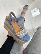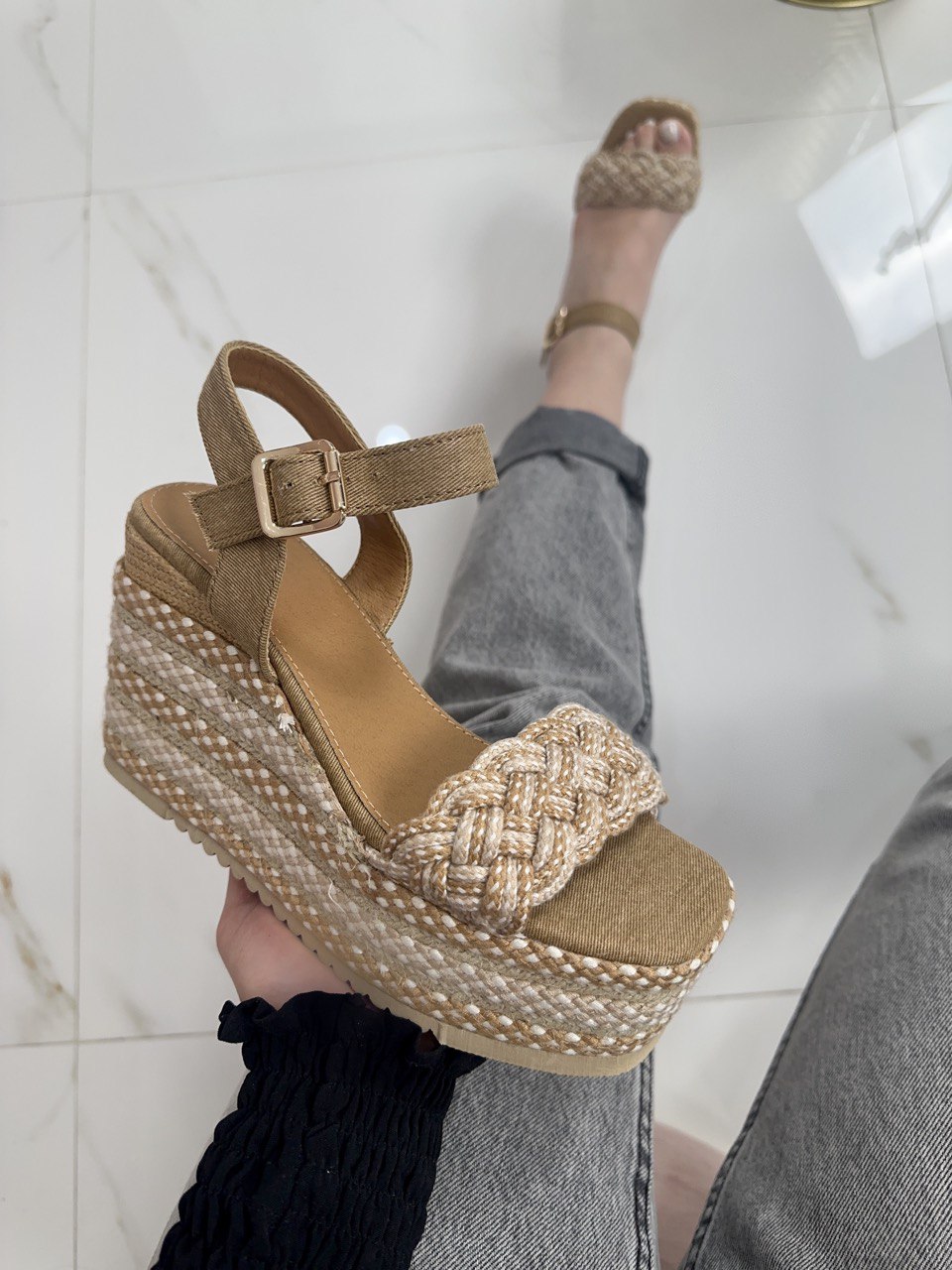 Sandali in tessuto con fascia larga a treccia , chiusura con cinturino , zeppa di 10 cm e plateau di 5 cm