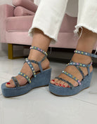 Sandali in camoscio , con fasce decorate con strass e borchie colorate , chiusura con cinturino , zeppa di 7 cm e plateau di 3 cm