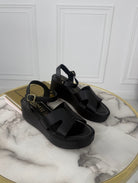 Sandali in pelle con fascia larga , chiusura con cinturino e zeppa di 5 cm.