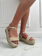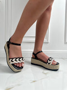 Sandali in ecopelle con fascia in corda intrecciata , chiusura con cinturino e zeppa di 5 cm