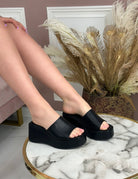 Sandali in ecopelle con fascia larga , aperti sul retro con zeppa di 6 cm e plateau di 3 cm