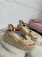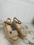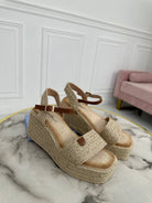 Sandali in tessuto con fascia larga , chiusura con cinturino e zeppa in corda di 7 cm