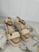 Sandali in tessuto con fascia larga , chiusura con cinturino e zeppa in corda di 7 cm
