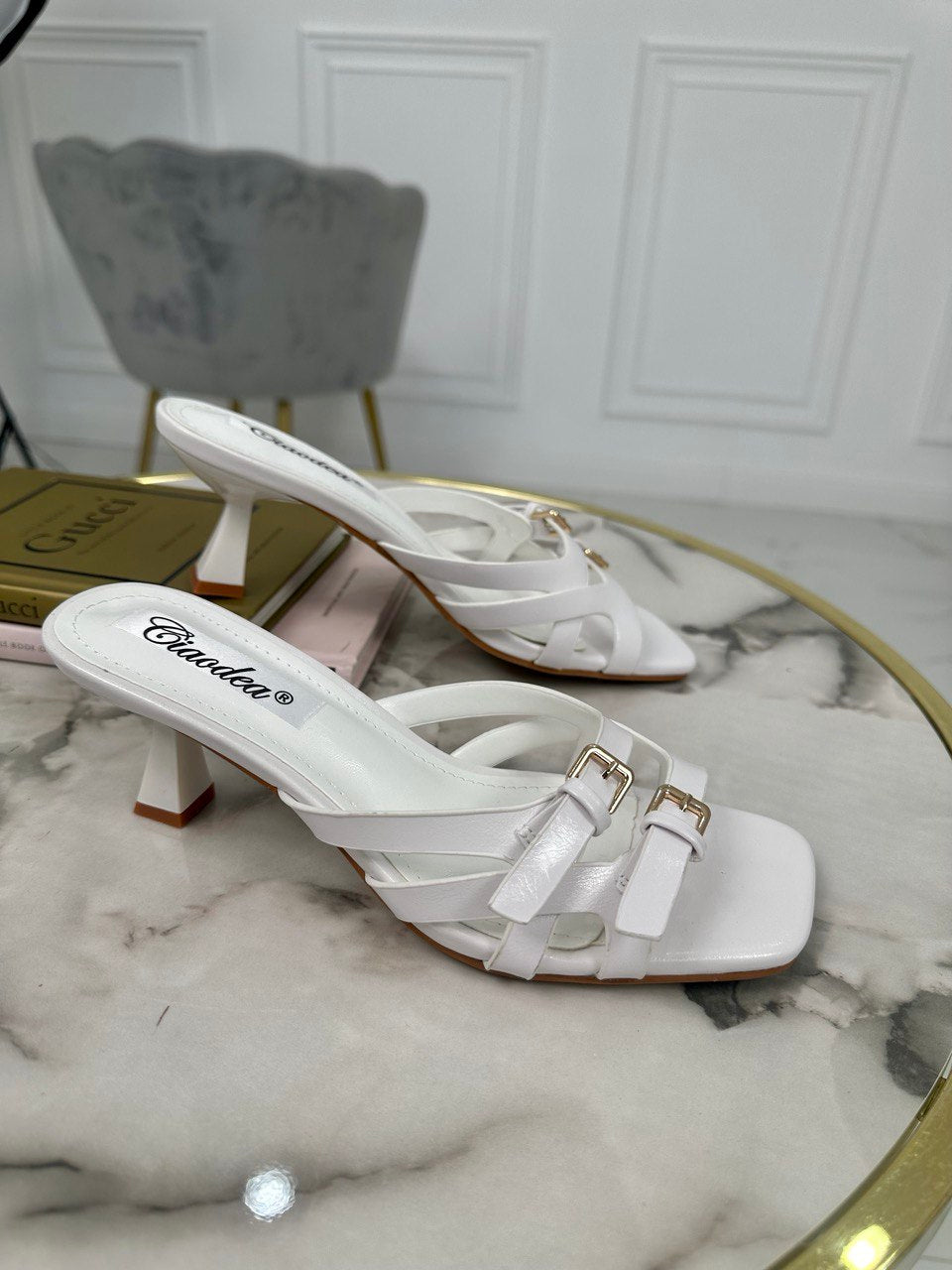 Sandali in ecopelle con fasce decorate con fibbie regolabili , aperti sul retro con tacco di 5 cm