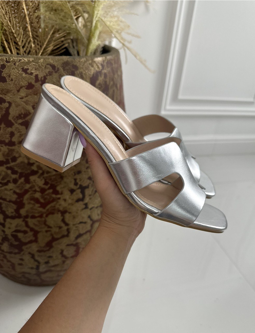 Sandali in ecopelle con fascia larga , aperte sul retro e tacco largo di 6 cm