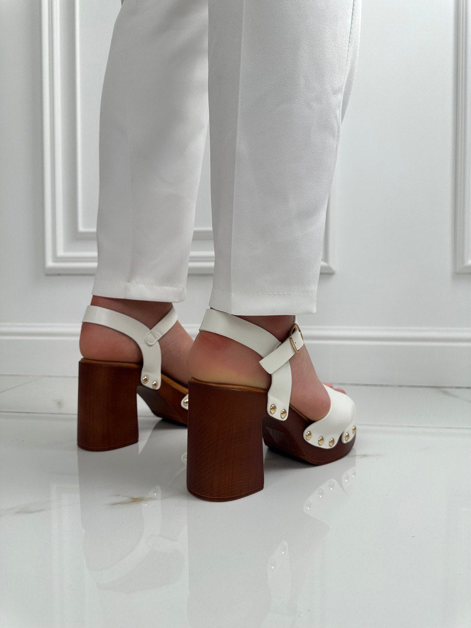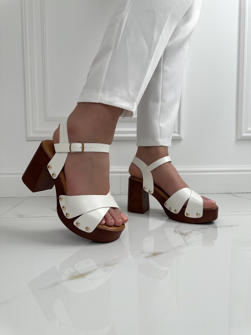 Sandali in ecopelle con fasce larghe ad incrocio , chiusura con cinturino , tacco largo di 8 cm e plateau di 2 cm