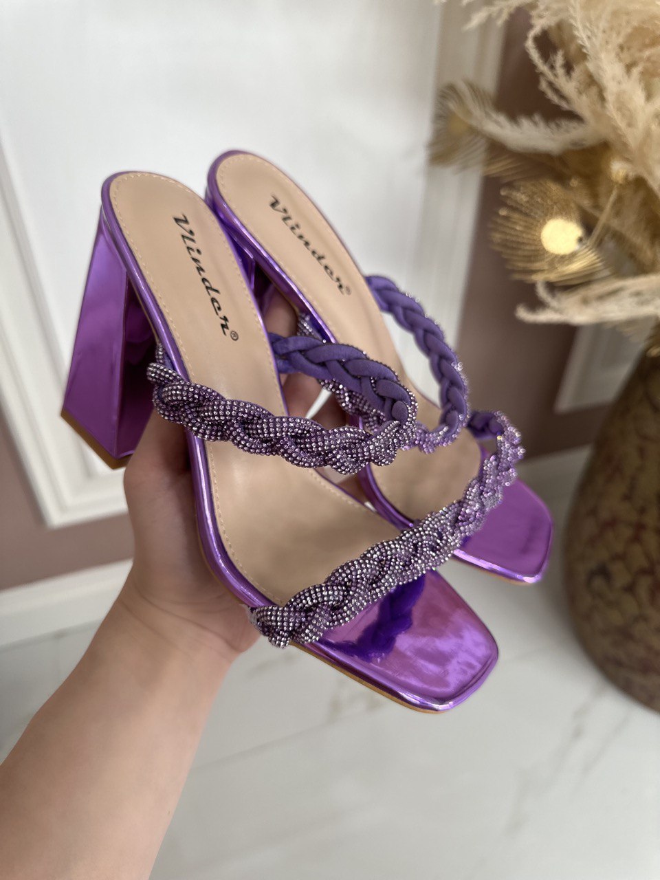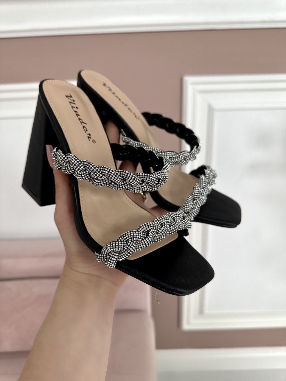 Sandali in ecopelle con fasce decorate con strass , aperti sul retro con tacco largo di 10 cm