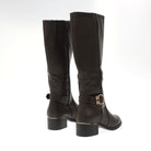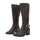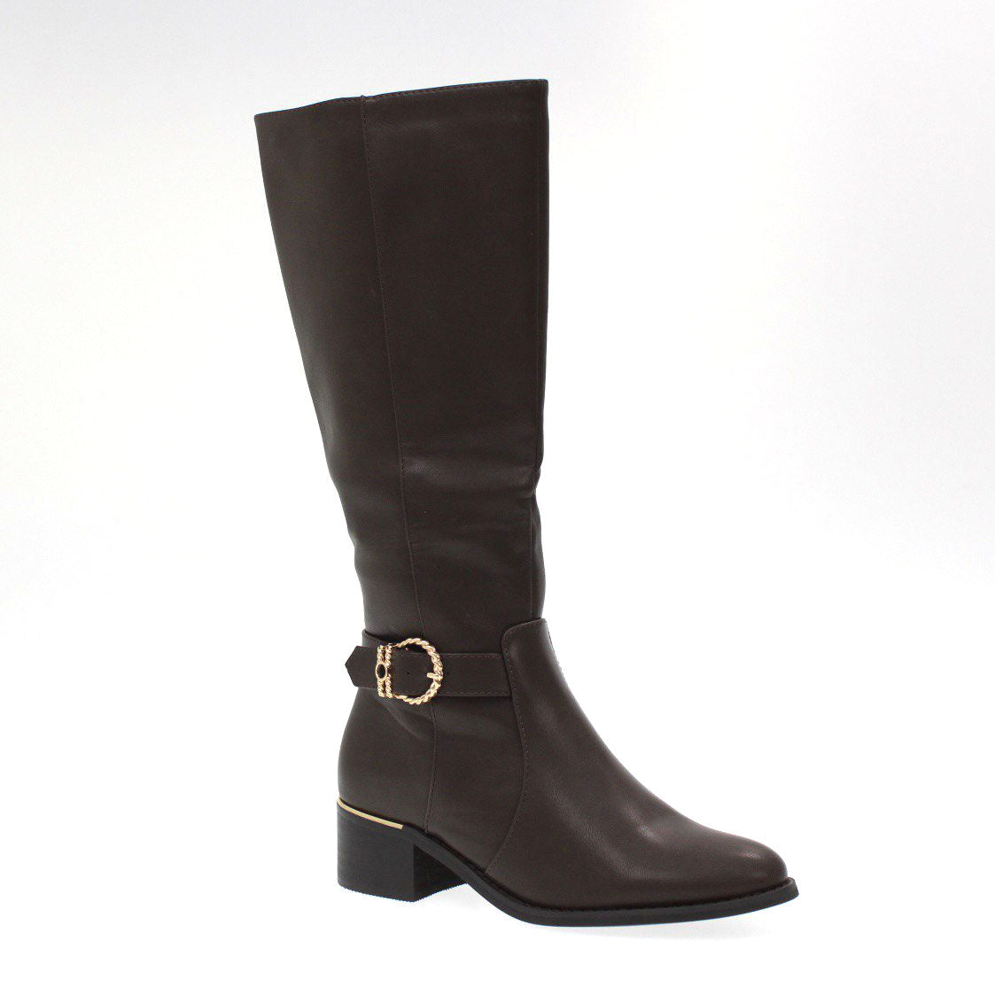 Stivale in ecopelle , con gambale al ginocchio , fibbia laterale dorata , chiusura con cerniera e tacco largo di 3 cm