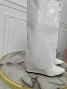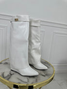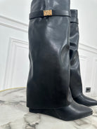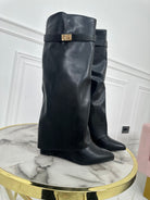 Stivale a punta con la zeppa intera alta 7 centimetri. Arriva fin sotto il ginocchio e porta il risvolto che copre l'intero gambale. Dettaglio dorato sul lato esterno