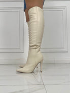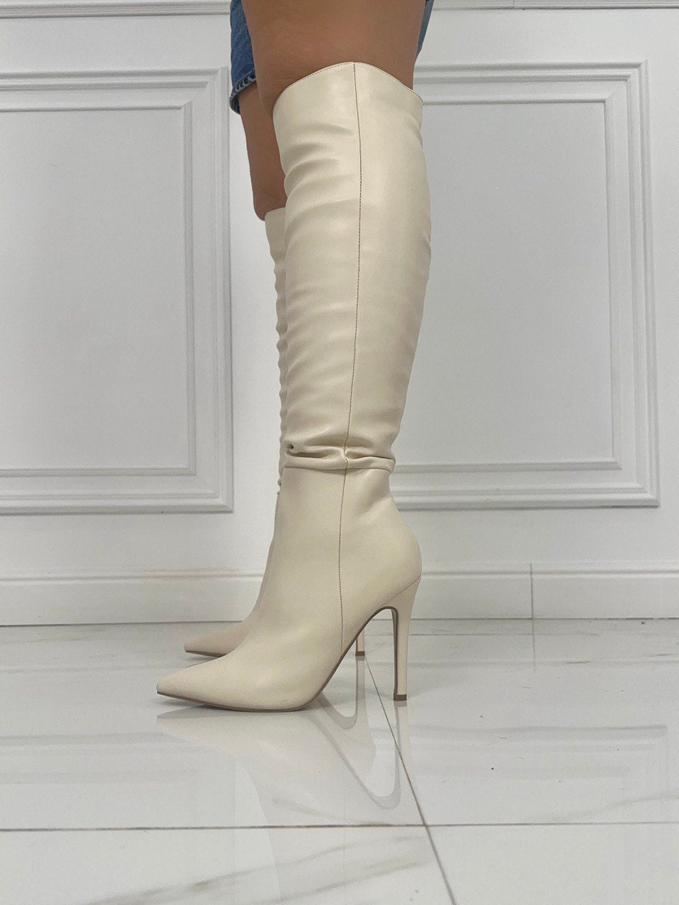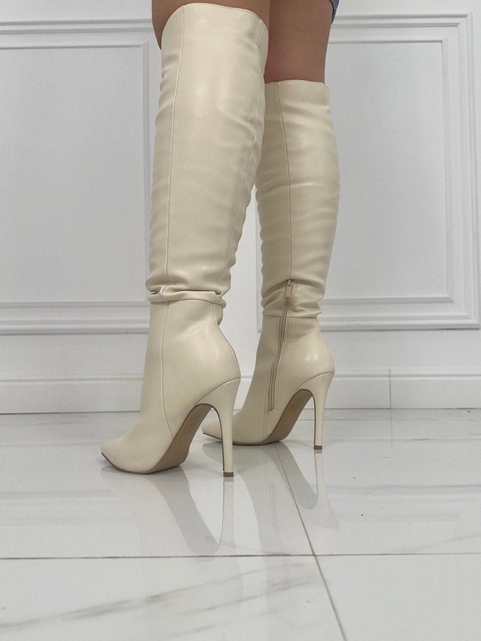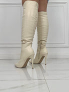 Stivale a punta in ecopelle , con gambale alto , chiusura con cerniera laterale e tacco a spillo di 11 cm