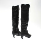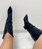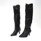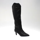 Stivale a punta in ecopelle con gambale alto al ginocchio , chiusura con cerniera laterale e tacco di 4 cm