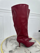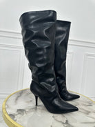 Stivale a punta in ecopelle, senza cerniera, si infila semplicemente. Largo alla gamba e al polpaccio, il tacco è a spillo alto 9 centimetri.
