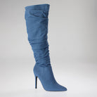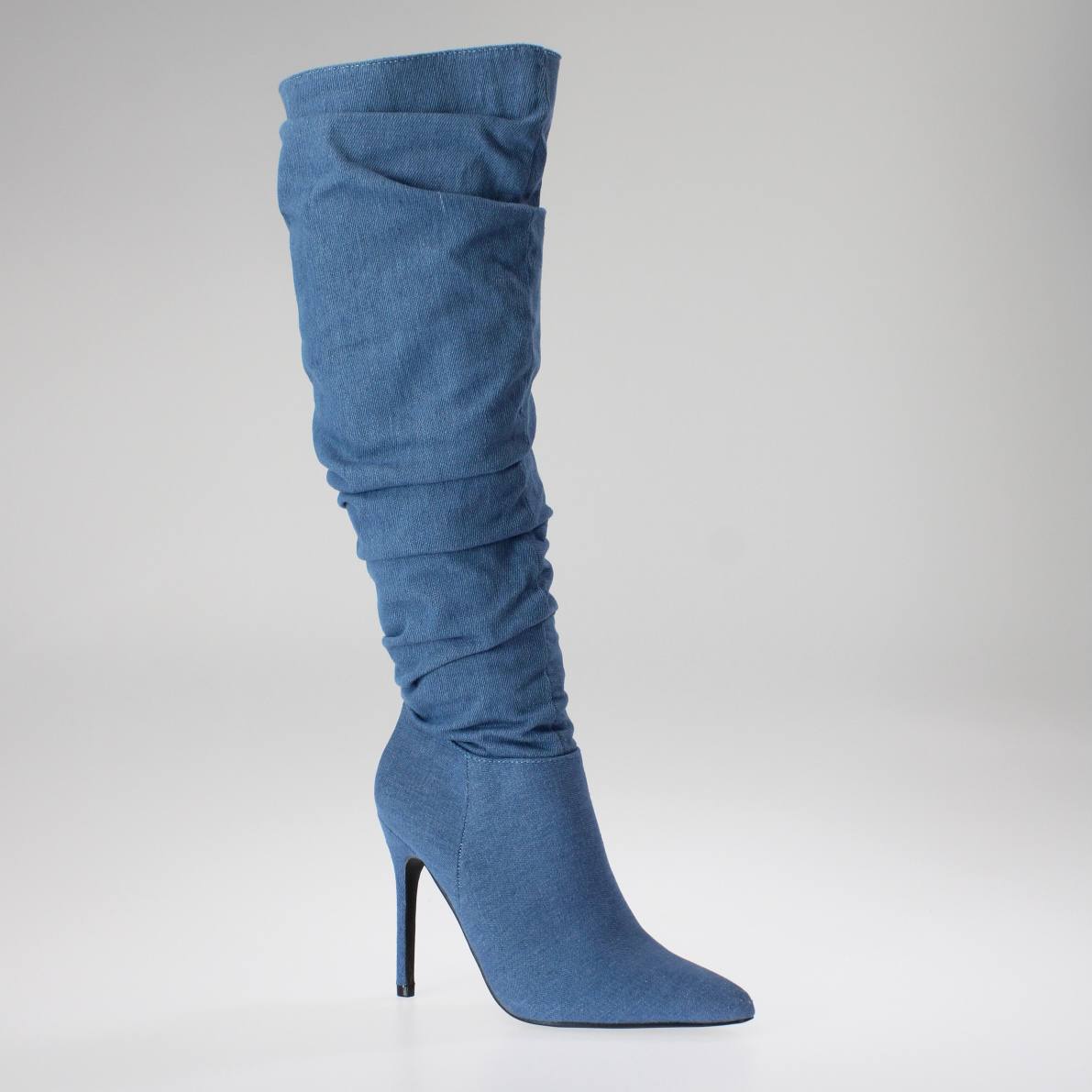 Stivale a punta in jeans con gambale drappeggiato , chiusura con cerniera laterale e tacco di 10 cm.