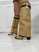Stivale in tessuto spuntato sul davanti con risvolto sul gambale , decorato con lucchetto laterale , chiusura con cerniera e tacco largo di 10 cm