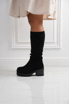 Stivali in camoscio a punta tonda , gambale medio , chiusura con cerniera laterale e tacco largo in gomma di 6 cm