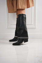 Stivale in ecopelle con gambale decorato con borchie in argento , chiusura con cerniera laterale e tacco largo di 6 cm