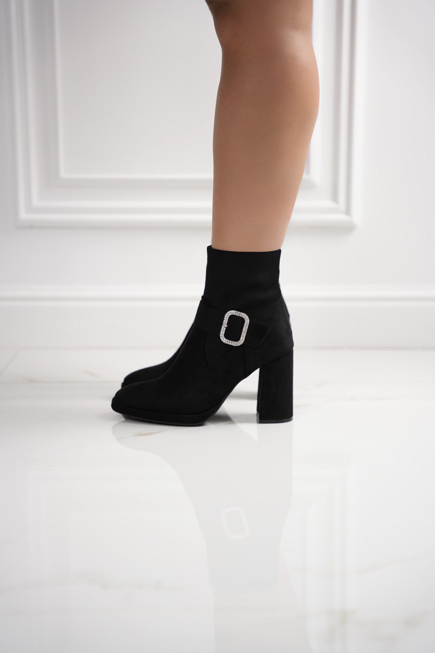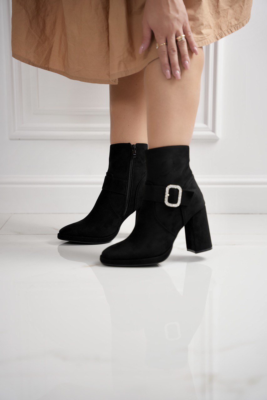 Stivaletti in camoscio decorati con fibbia laterale ricoperta di piccoli strass interno in tessuto sintetico , chiusura con cerniera laterale e tacco largo di 8 cm