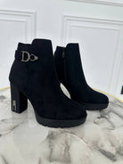 Tronchetto in camoscio con il tacco largo alto 9 centimetri. La chiusura è in cerniera. Il dettaglio gioiello nel laterale esterno.