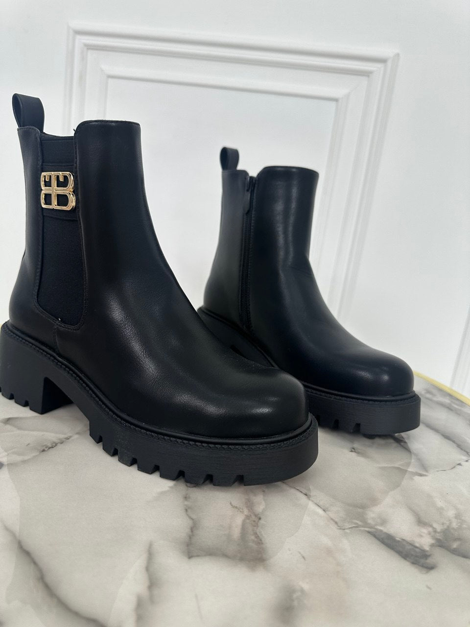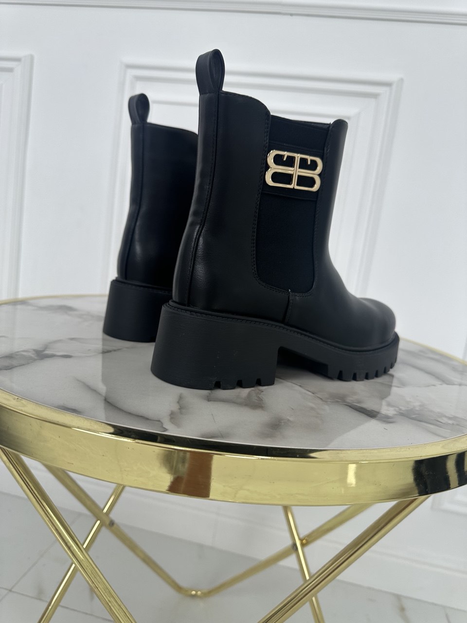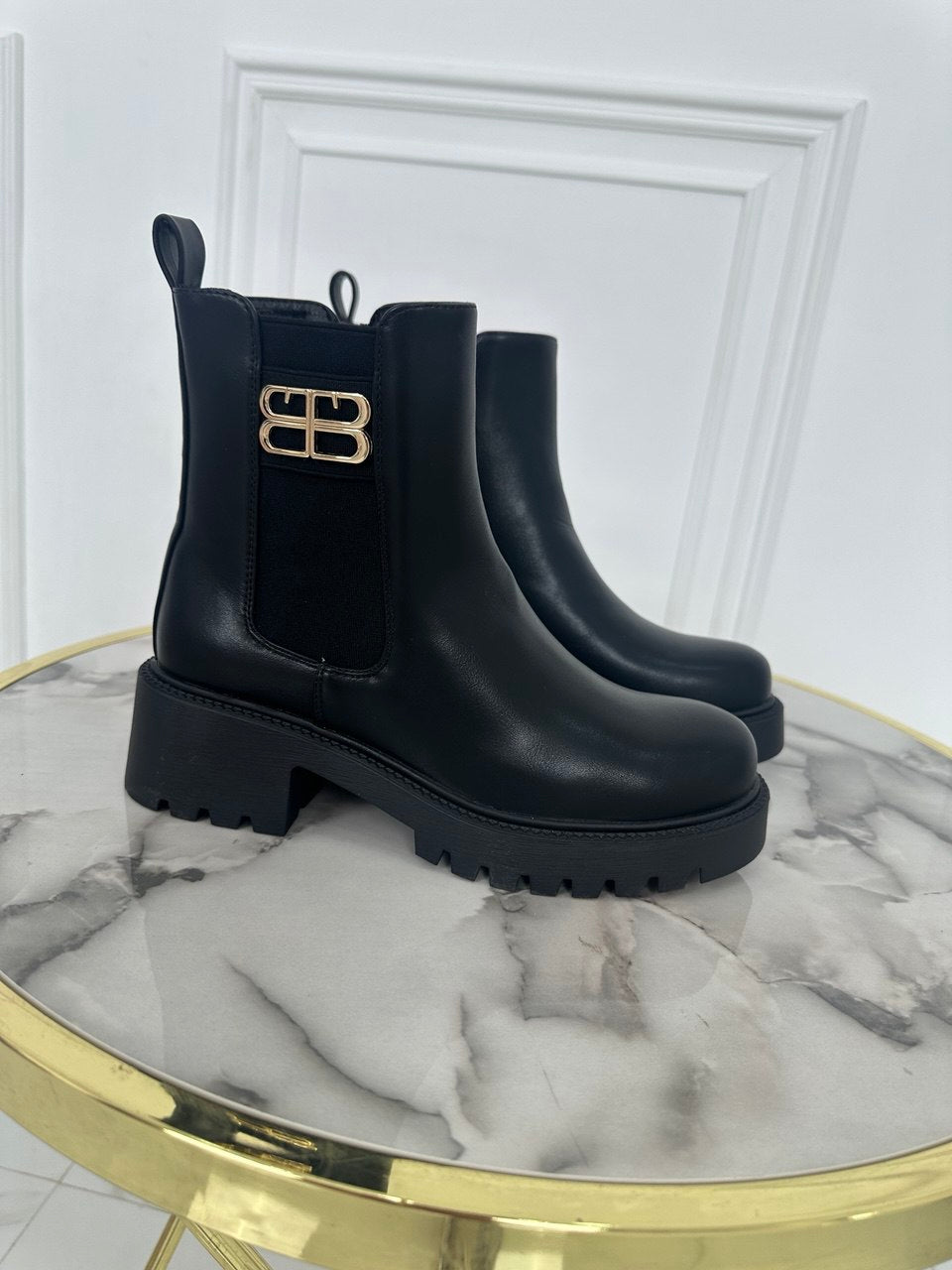 Stivaletto corto sopra alla caviglia in ecopelle, con tacco in gomma alto 4 centimetri. La chiusura è in cerniera, ha l'elastico nel lato esterno e un dettaglio dorato.