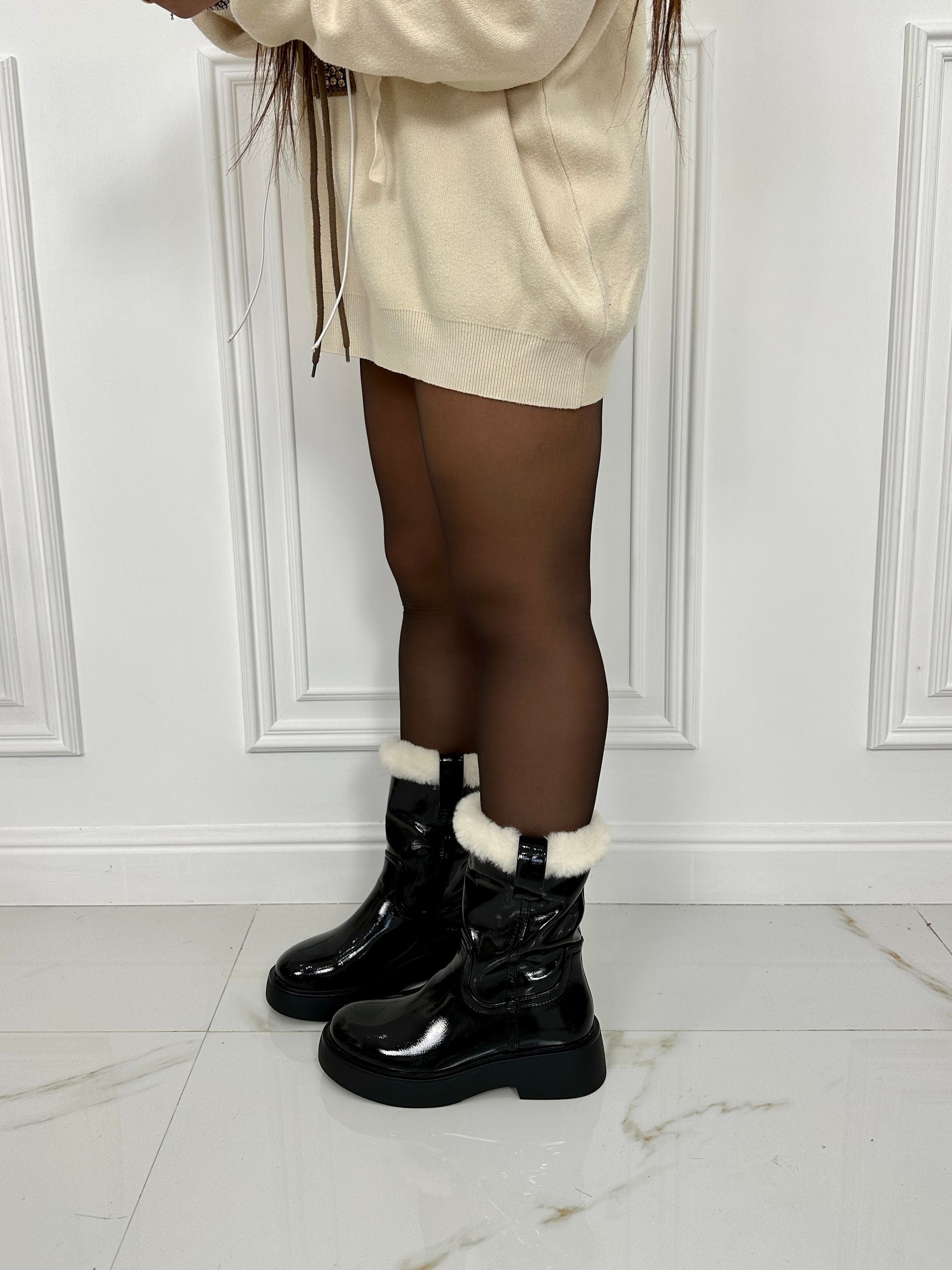 Stivaletti in vernice con gambale decorato con pelliccia , chiusura con cerniera laterale e fondo in gomma di 4 cm