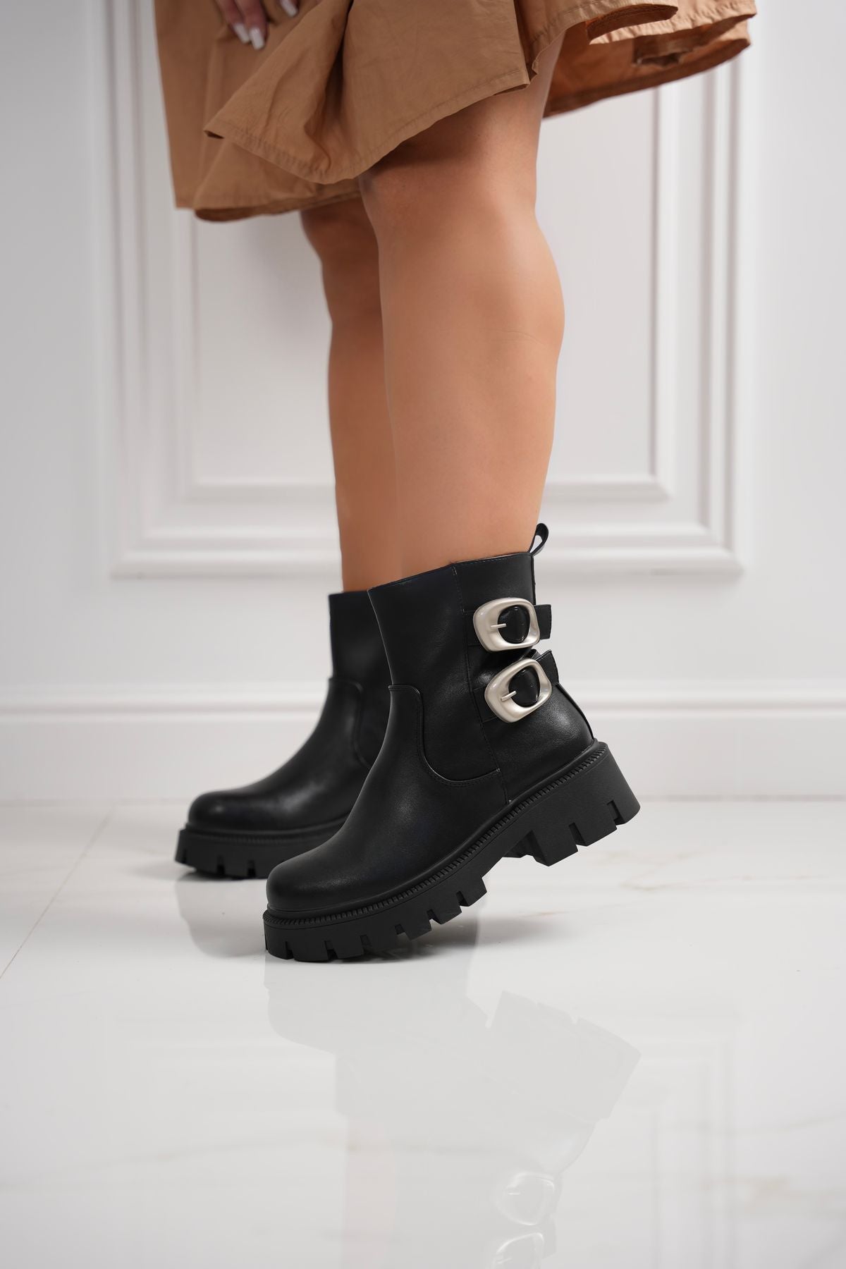 Stivaletti in ecopelle con fibbiette laterali , chiusura con cerniera , interno in tessuto e fondo in gomma di 4 cm
