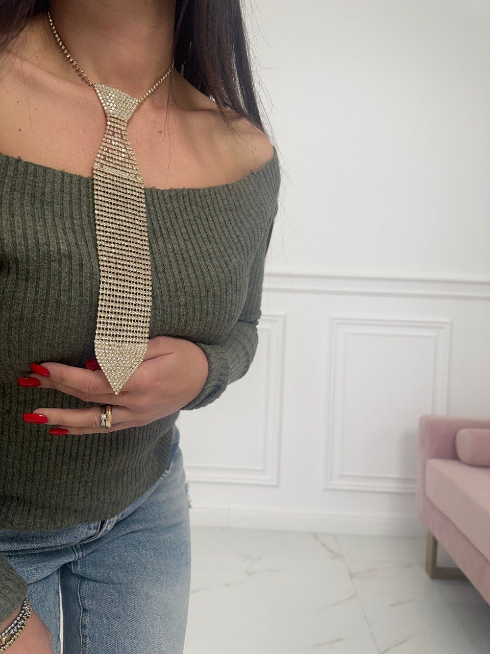 Collana a forma di cravatta decorata interamente con strass , chiusura con gancio regolabile.