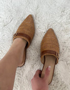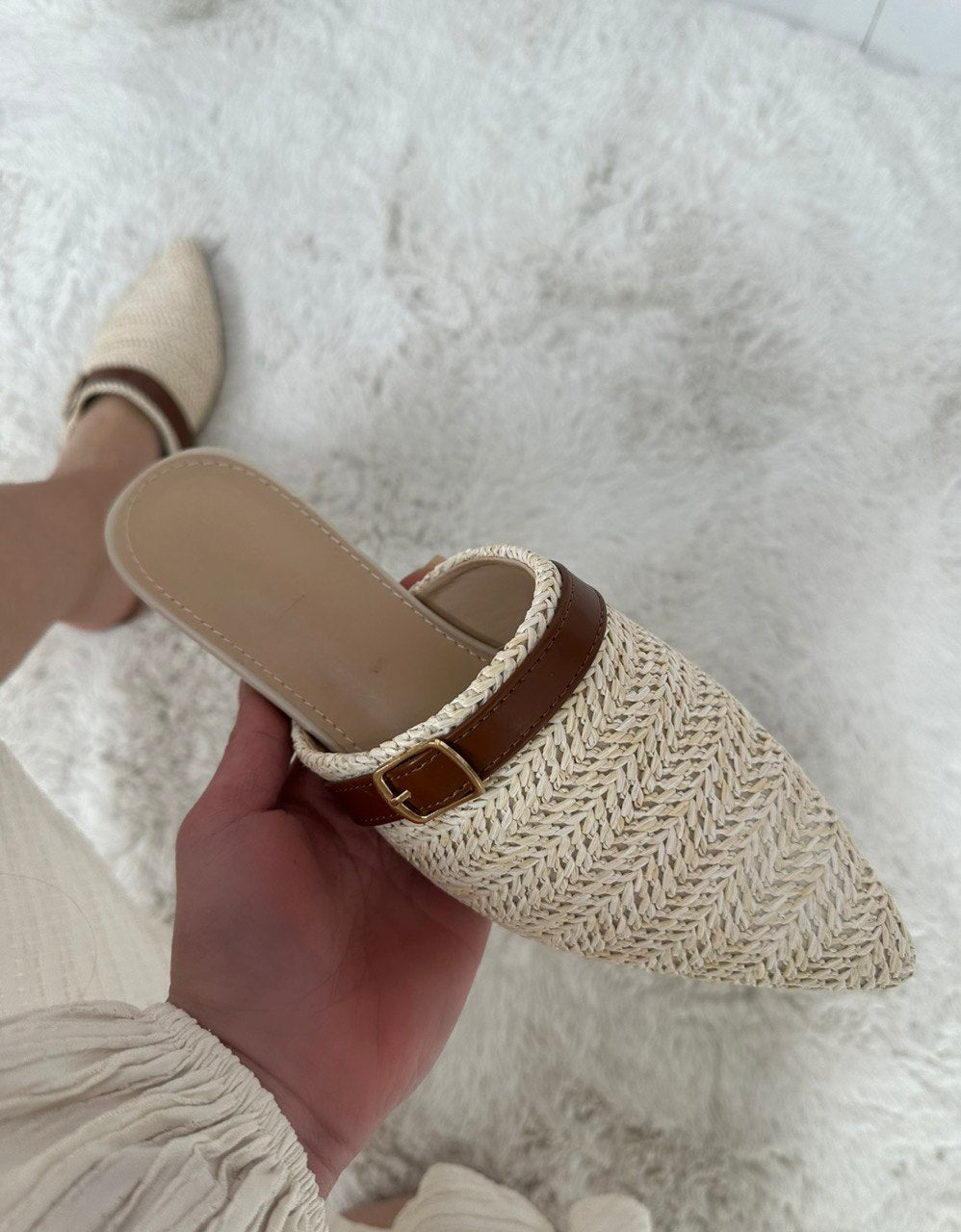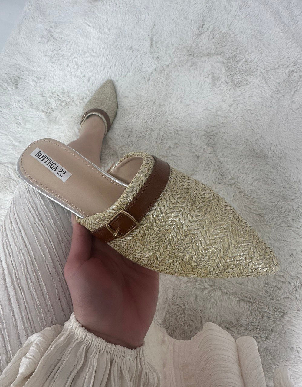 Sabot a punta in paglia con interno in ecopelle , fibbia sul davanti , aperte sul retro con fondo in gomma