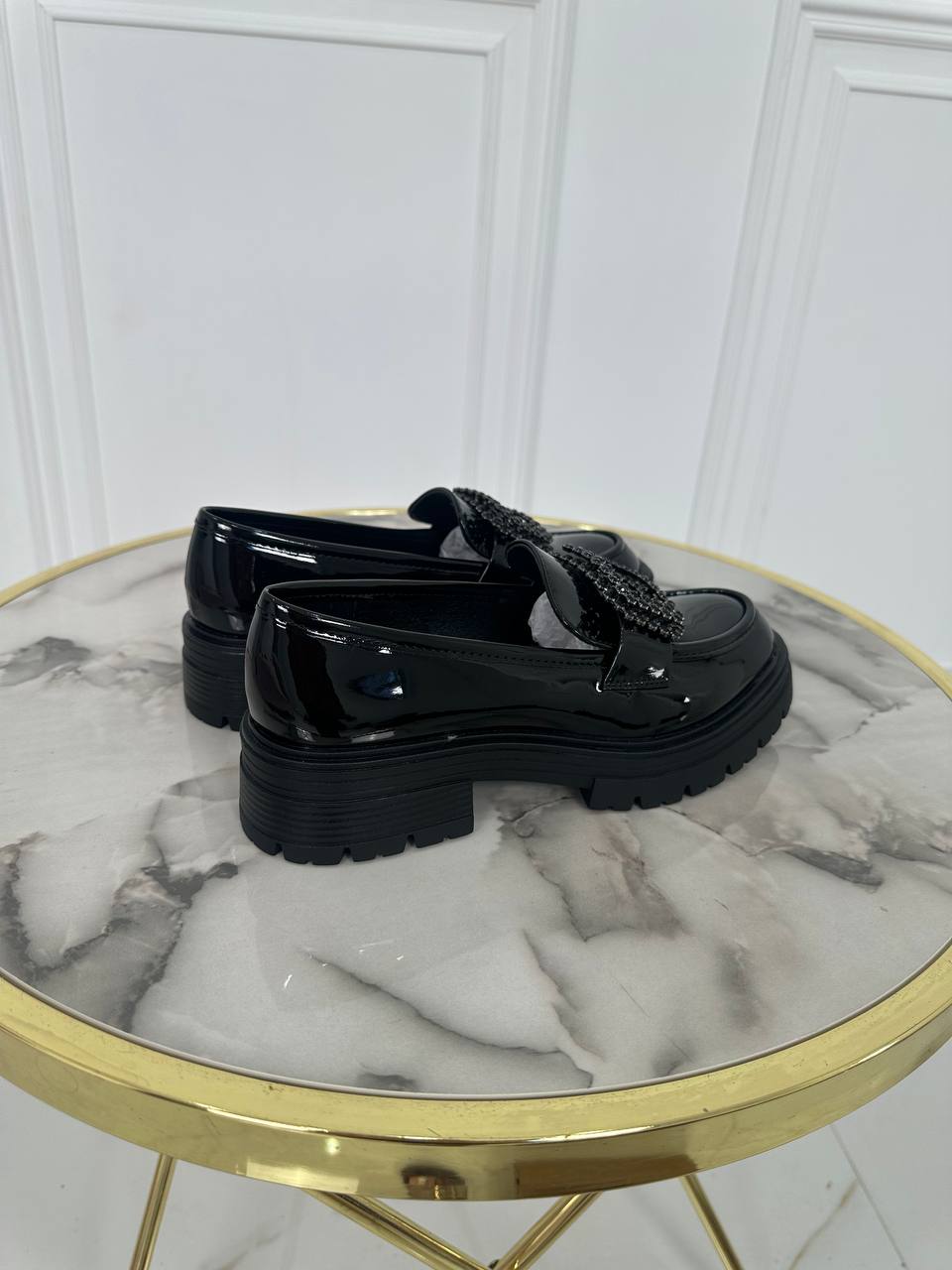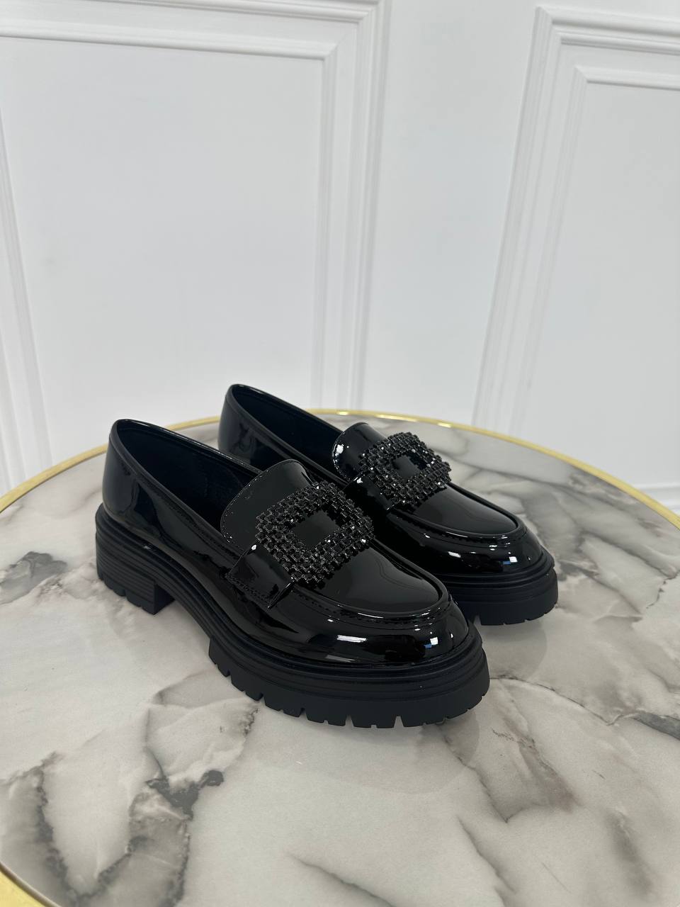 Mocassine in vernice con para dritta di 3 centimetri. Ha un dettaglio argento sul collo del piede
