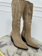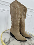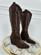 Texano in camoscio con disegno evidente in cuciture bianche, ha il tacco largo alto 7 centimetri e la cerniera all'interno per metà