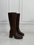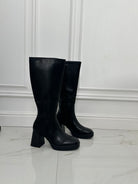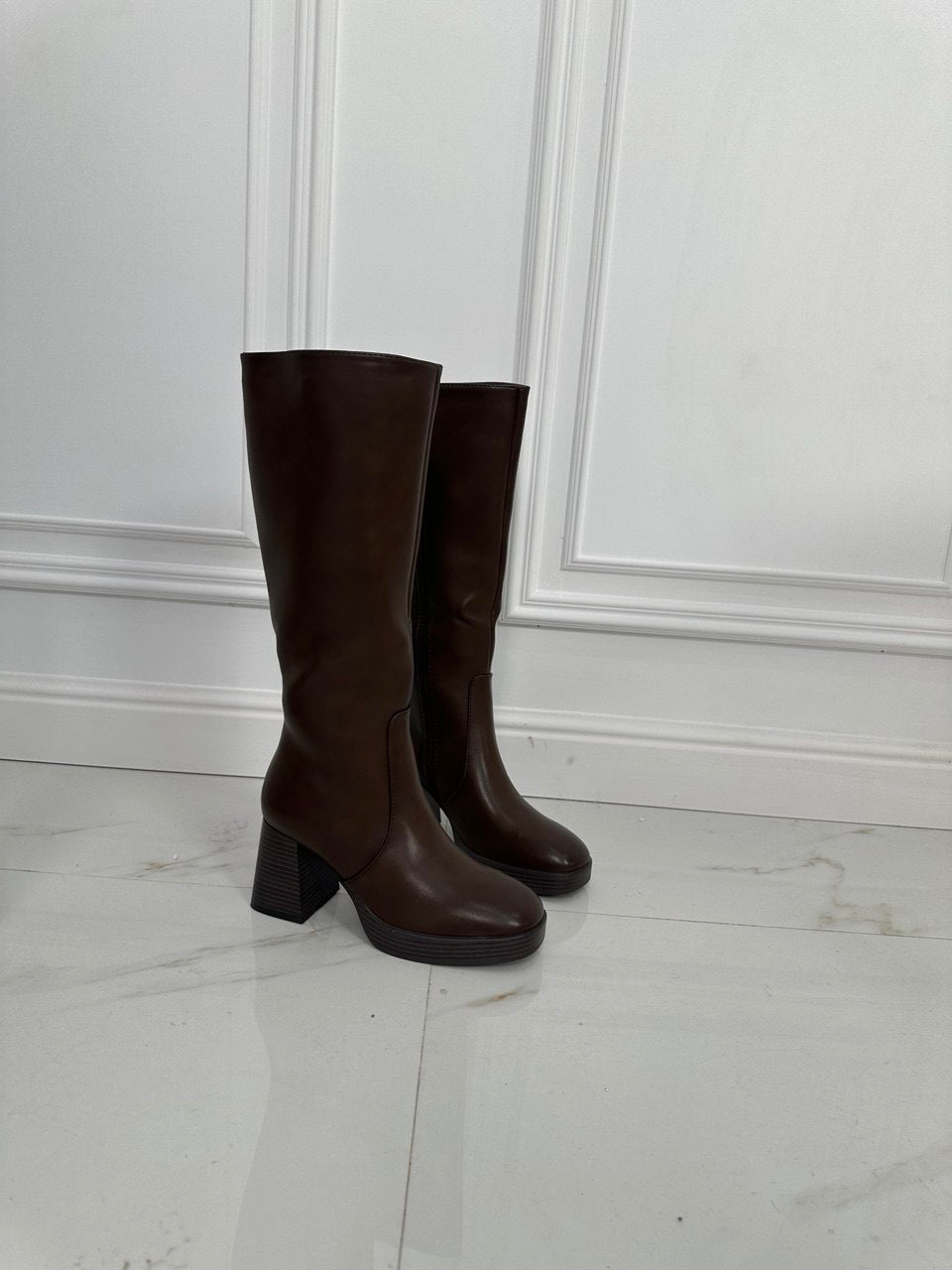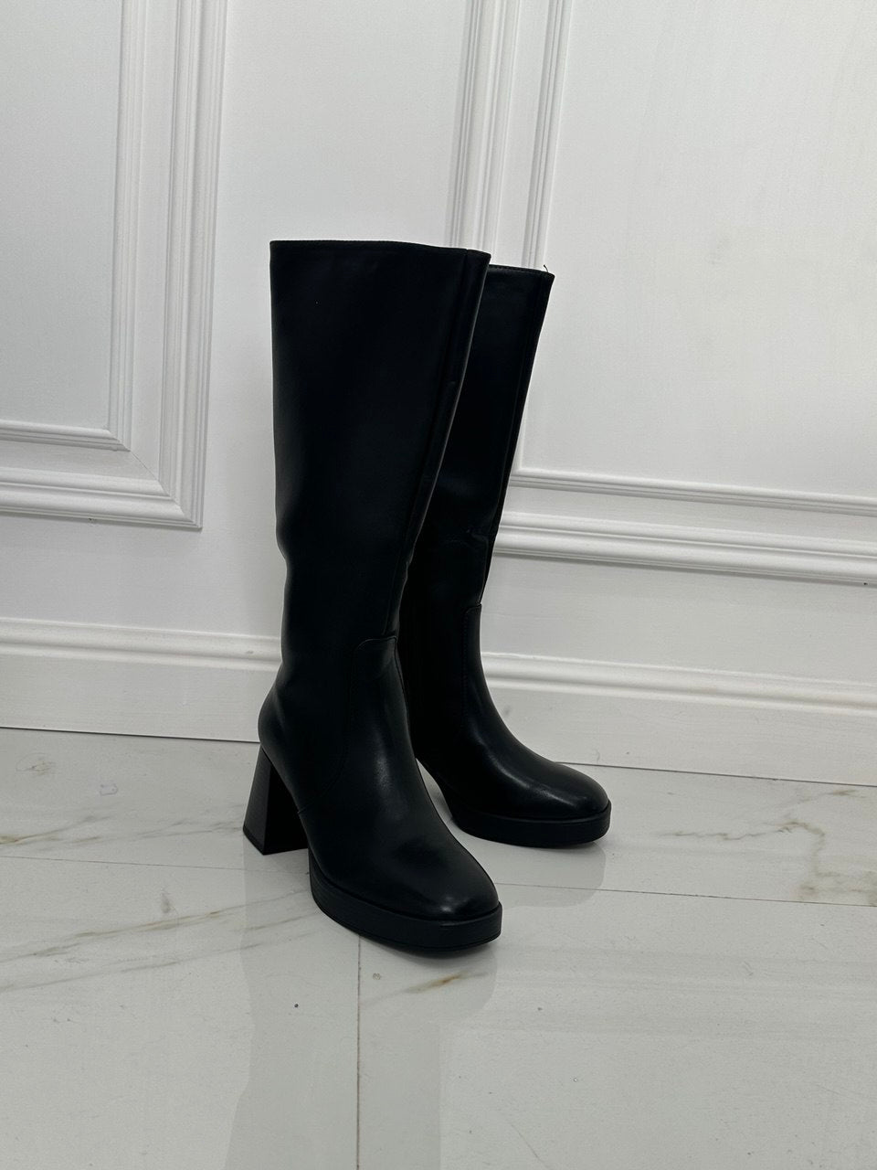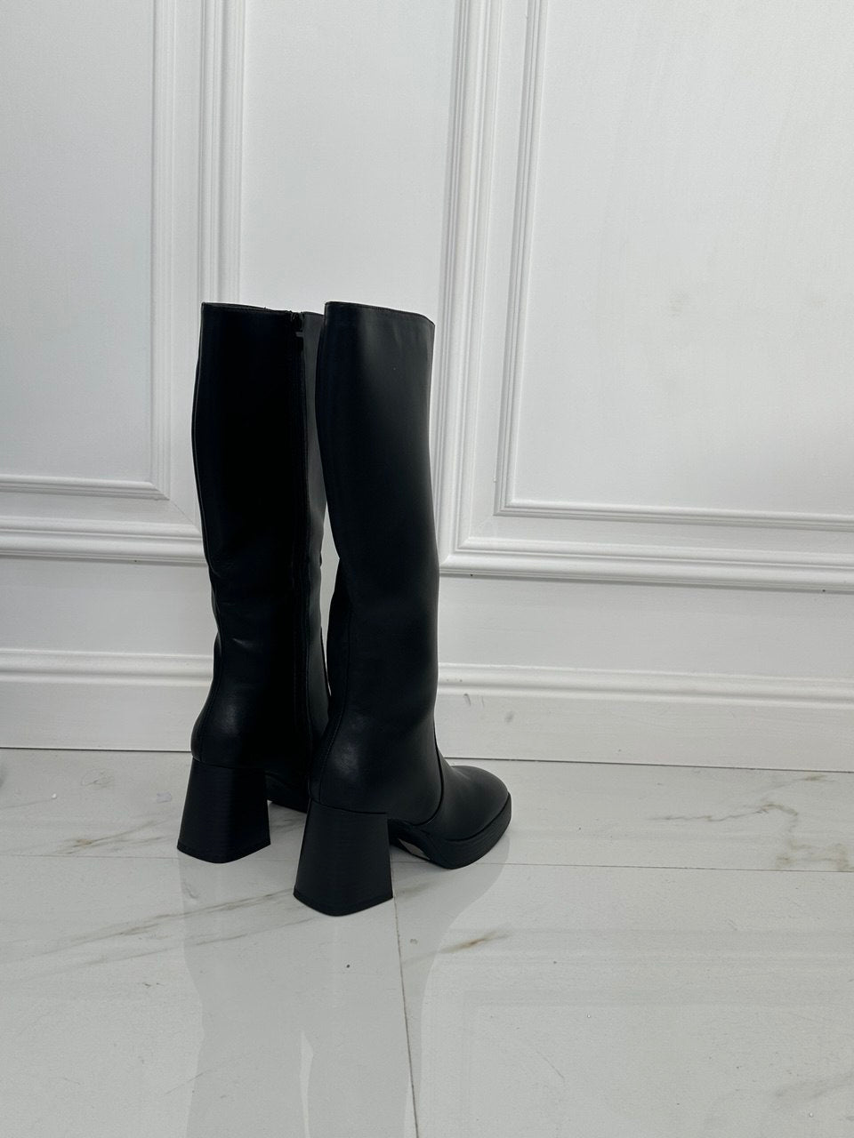 Stivale in ecopelle a pianta larga, con tacco largo di 6 centimetri, ha la cerniera come chiusura.