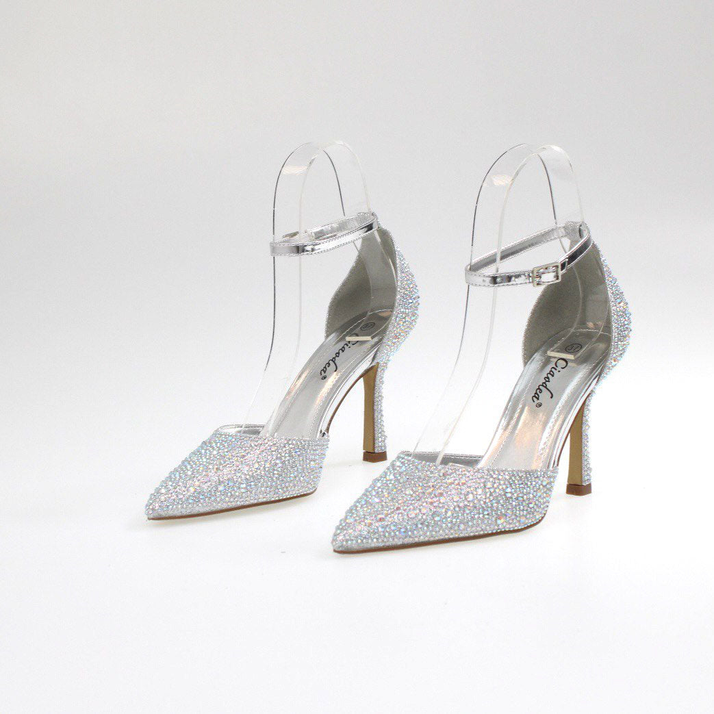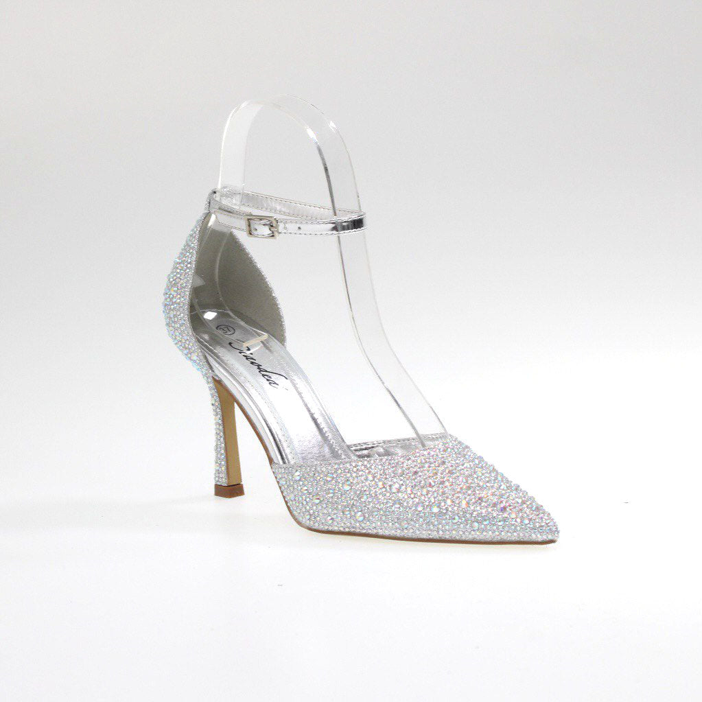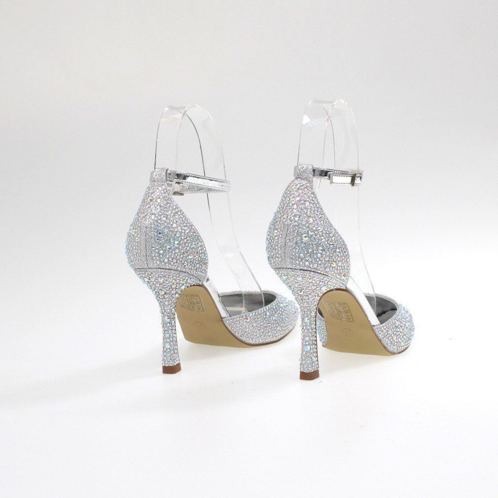 Pointed pump with upper covered in rhinestones, strap closure and 9 cm heel