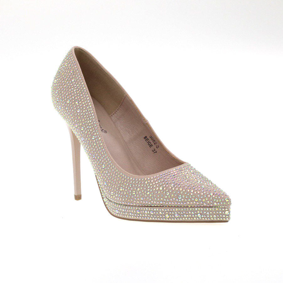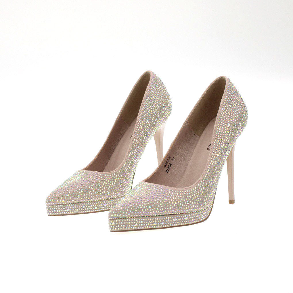 Decolletè in raso decorate interamente con strass , plateau di 2 cm e tacco a spillo di 11 cm