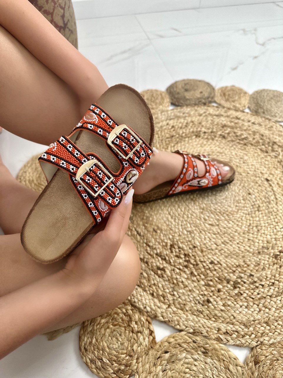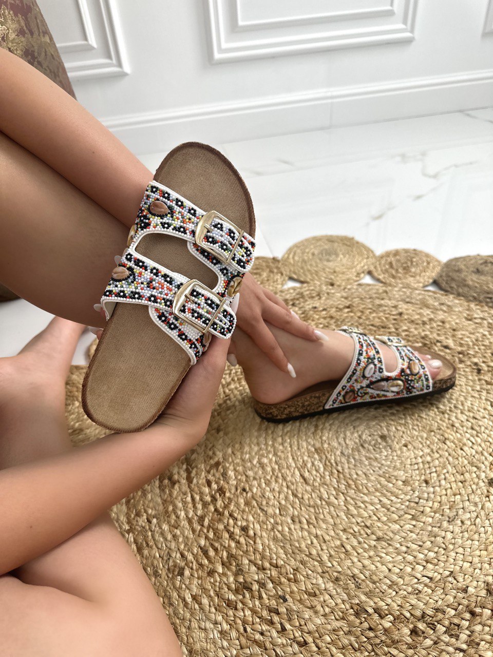 Pantofolina in ecopelle decorata con piccole pietre colorate e conchiglie , doppia fibbia regolabile e fondo in gomma