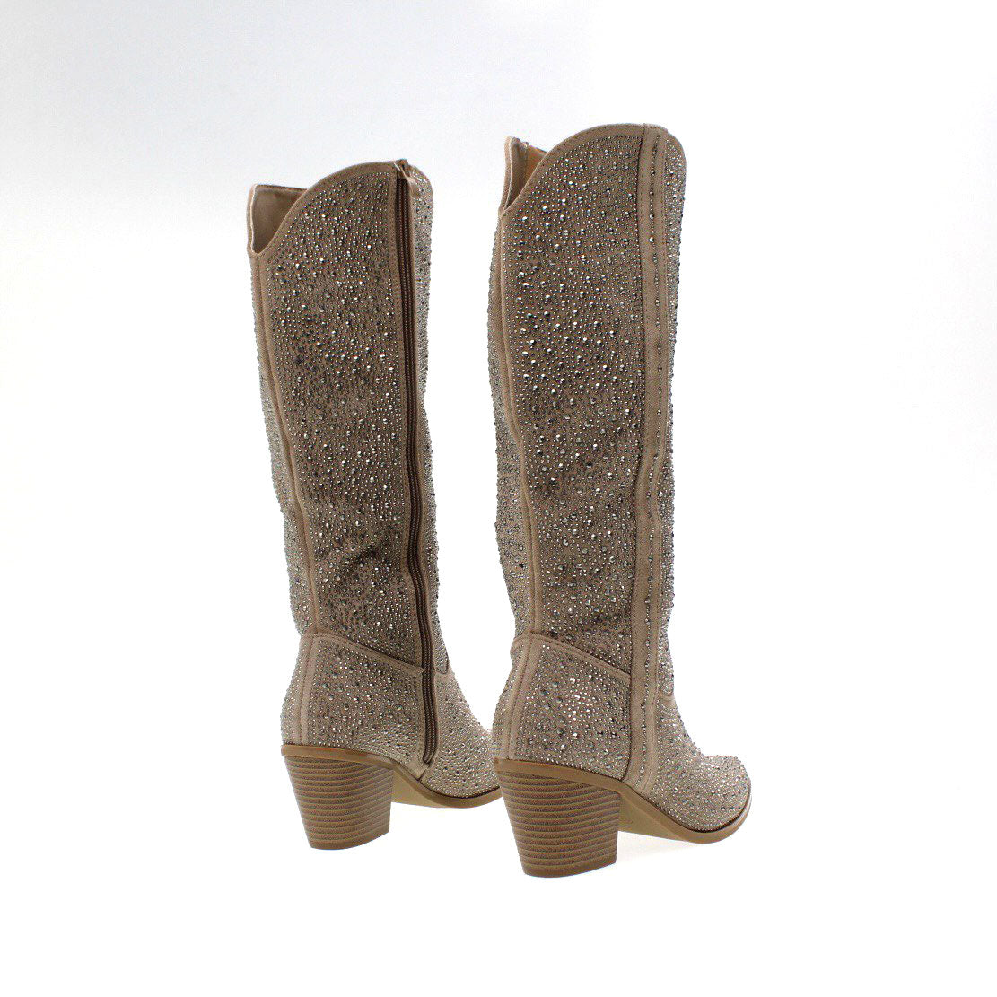 Camperos a punta in tessuto ricoperto interamente di strass , chiusura con cerniera e tacco largo di 6 cm