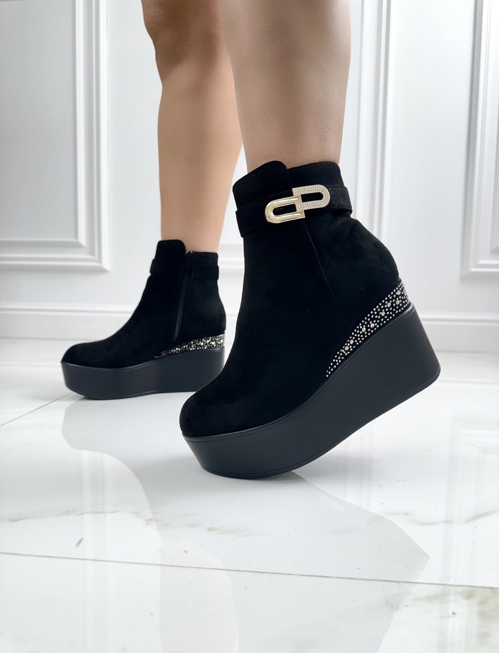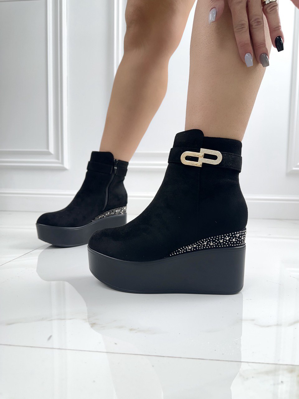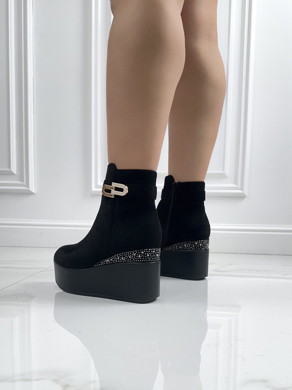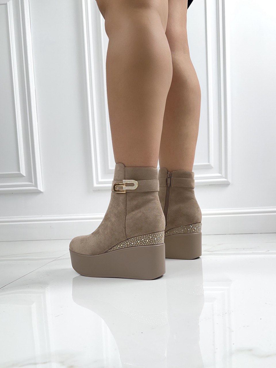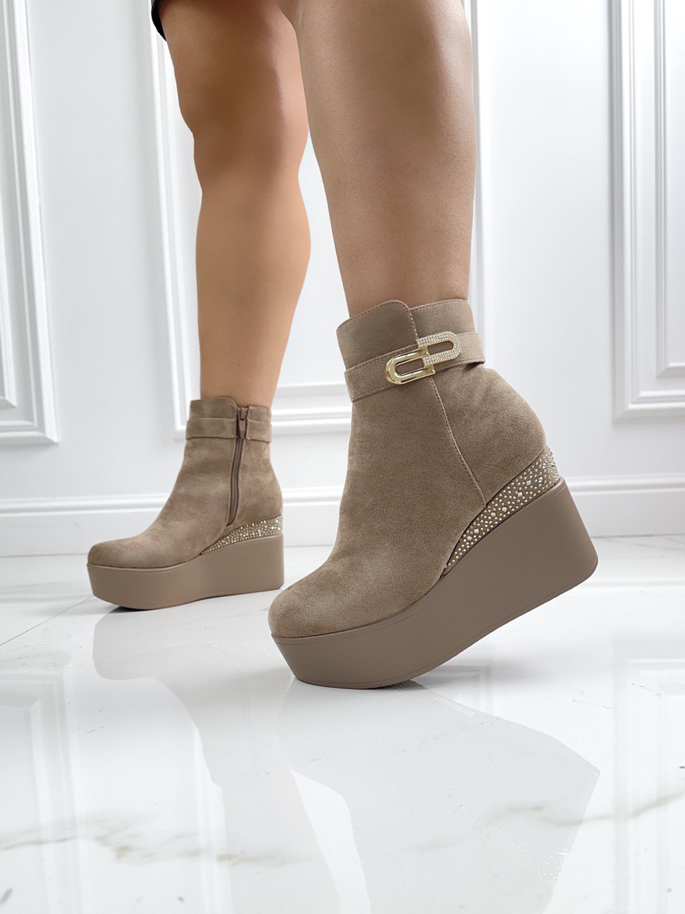 Stivaletti in camoscio decorato con piccoli strass sul fondo , dettaglio laterale dorato , chiusura con cerniera e zeppa intera di 5 cm