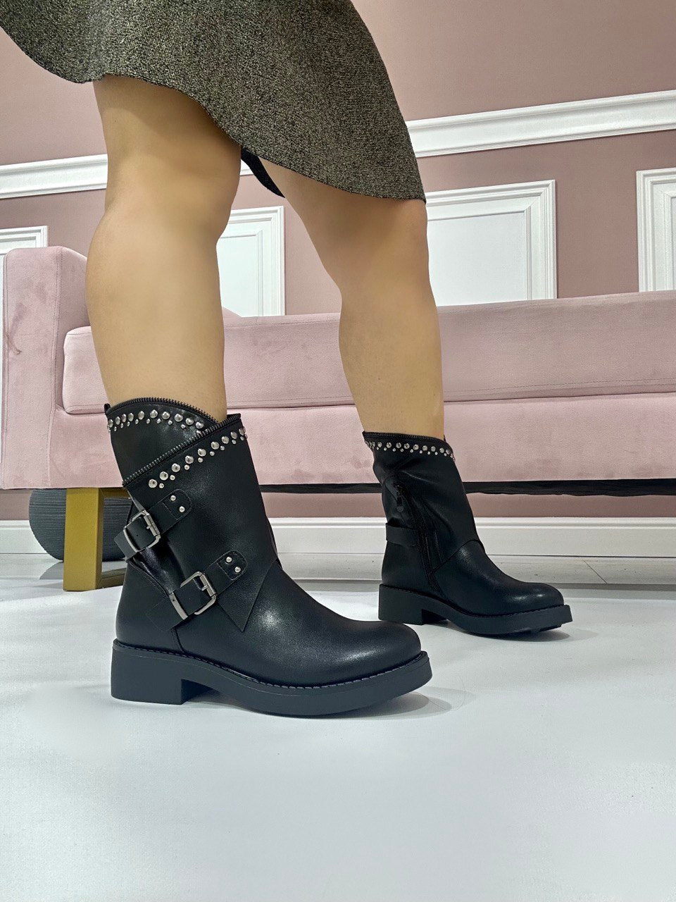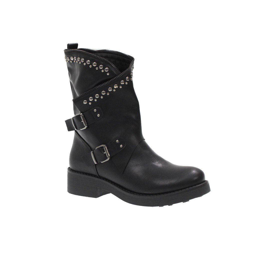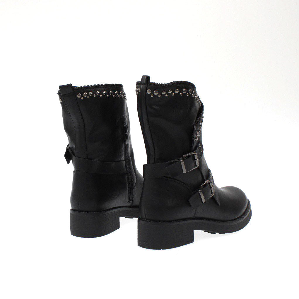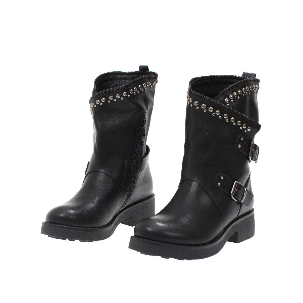 Stivaletti in ecopelle con borchie e fibbie laterali , chiusura con cerniera e fondo in gomma di 3 cm