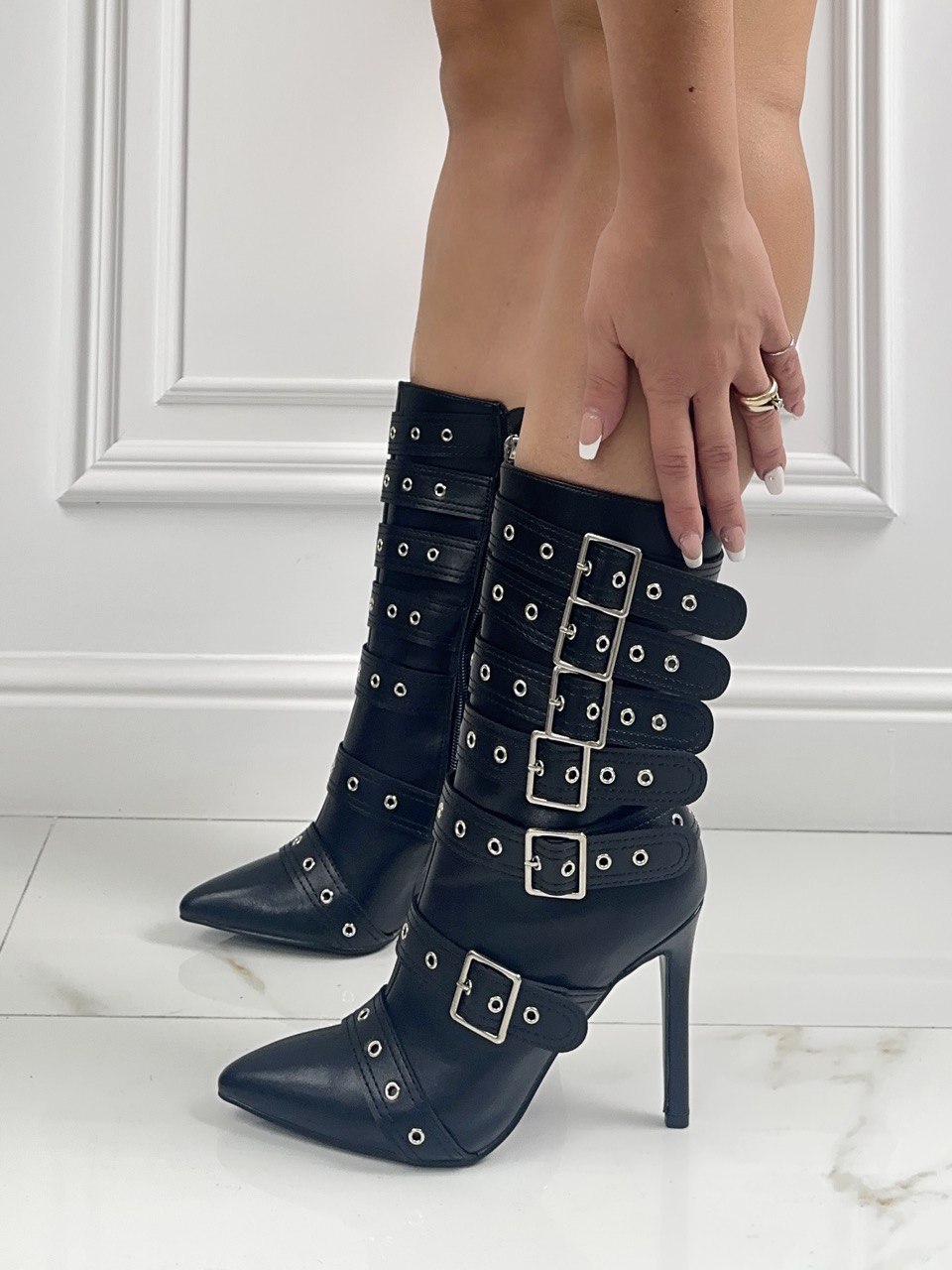 Stivaletti a punta in ecopelle con gambale decorato con fibbie laterali , chiusura con cerniera e tacco a spillo di 10 cm