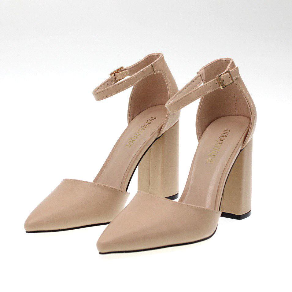 Pointed decolletè in faux leather, strap closure and 9 cm wide heel